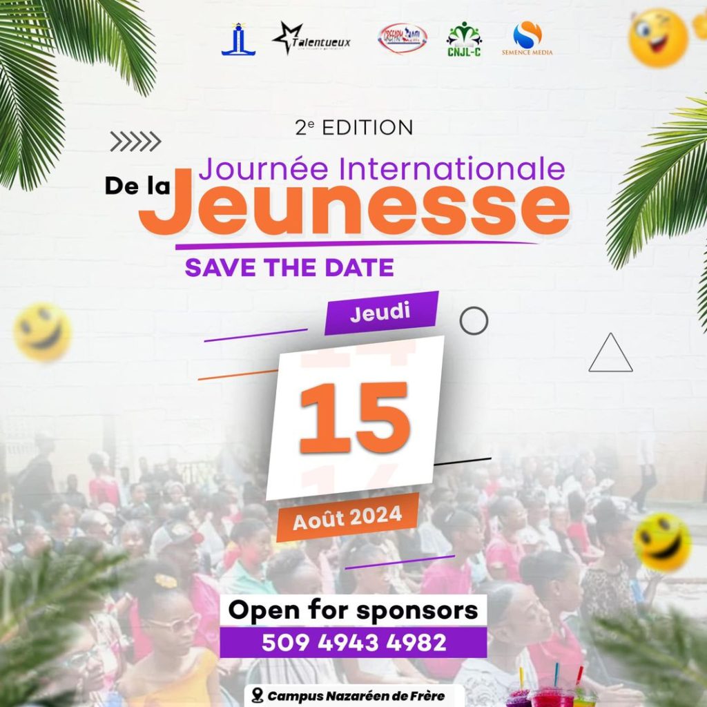 La segunda edición de la Jornada Internacional de la Juventud iniciada por Liajech se llevará a cabo el 15 de agosto de 2024, en el campus Nazaréen del hermano de Puerto Príncipe, Haití. Organizada por Les Talentueux, Grefarm-Haiti, CLJN-C y Semence Média, esta jornada promete ser rica en actividades e intercambios constructivos. El programa incluye paneles de discusión sobre temas cruciales como la economía, el futuro de la juventud y las relaciones románticas, así como actuaciones.artistas evangélicos. Esta es una oportunidad única para que jóvenes de todas las edades se reúnan y participen en una jornada recreativa inolvidable.