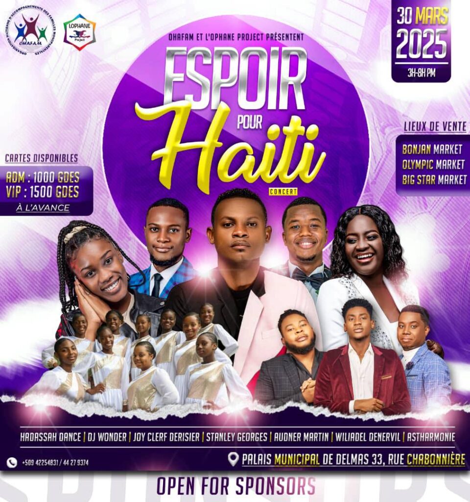 A concierto evangélico solidaridad para Familias de una sola parada en Haití9. El 30 de marzo de 2025 se llevará a cabo en el Palacio Municipal de Delmas. organizado conjuntamente por el Proyecto Ohafam y Ophane, este evento tiene como objetivo brindar apoyo a las casas uniparentales haitianas, que representan alrededor del 60% del país en el país.