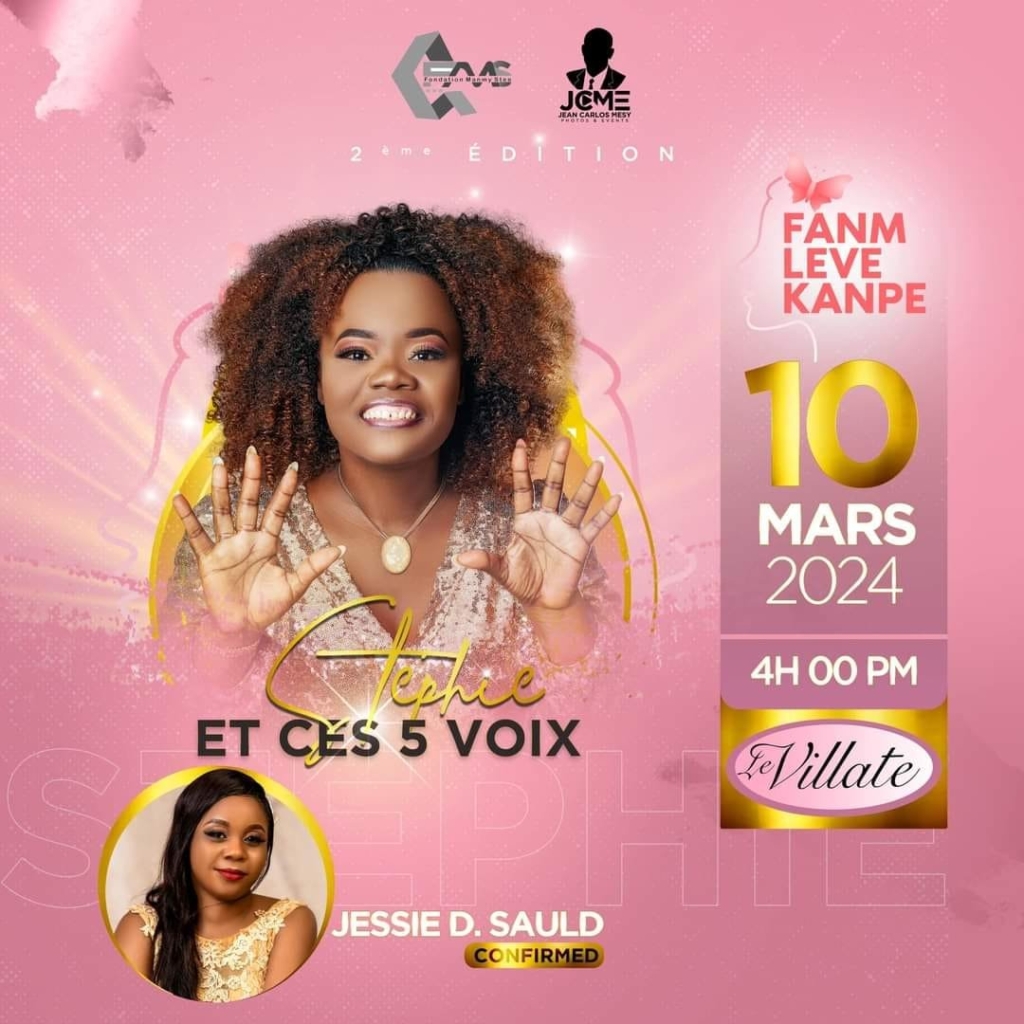 El entusiasta anuncio de la cantante Stephie Pierre confirmó la presencia de cinco artistas de excepción para la segunda edición de su gran espectáculo, “Stephie et ces 5 Voix”, prevista para el 10 de marzo. Bajo el cautivador tema “Fanm Leve Kanpe”, este evento promete una velada inolvidable con talentos vocales excepcionales como: Jessie Desir Sauld, Leila Chery, Auralie AntoineVava Sylvain, Myrline Louis.